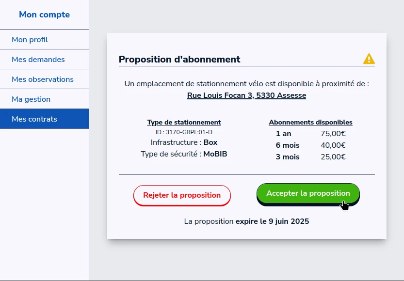 Nous vous informerons dès qu'un stationnement sera disponible à proximité. Sinon, nous inciterons la commune à installer davantage de stationnements vélo répondant aux besoins signalés.
